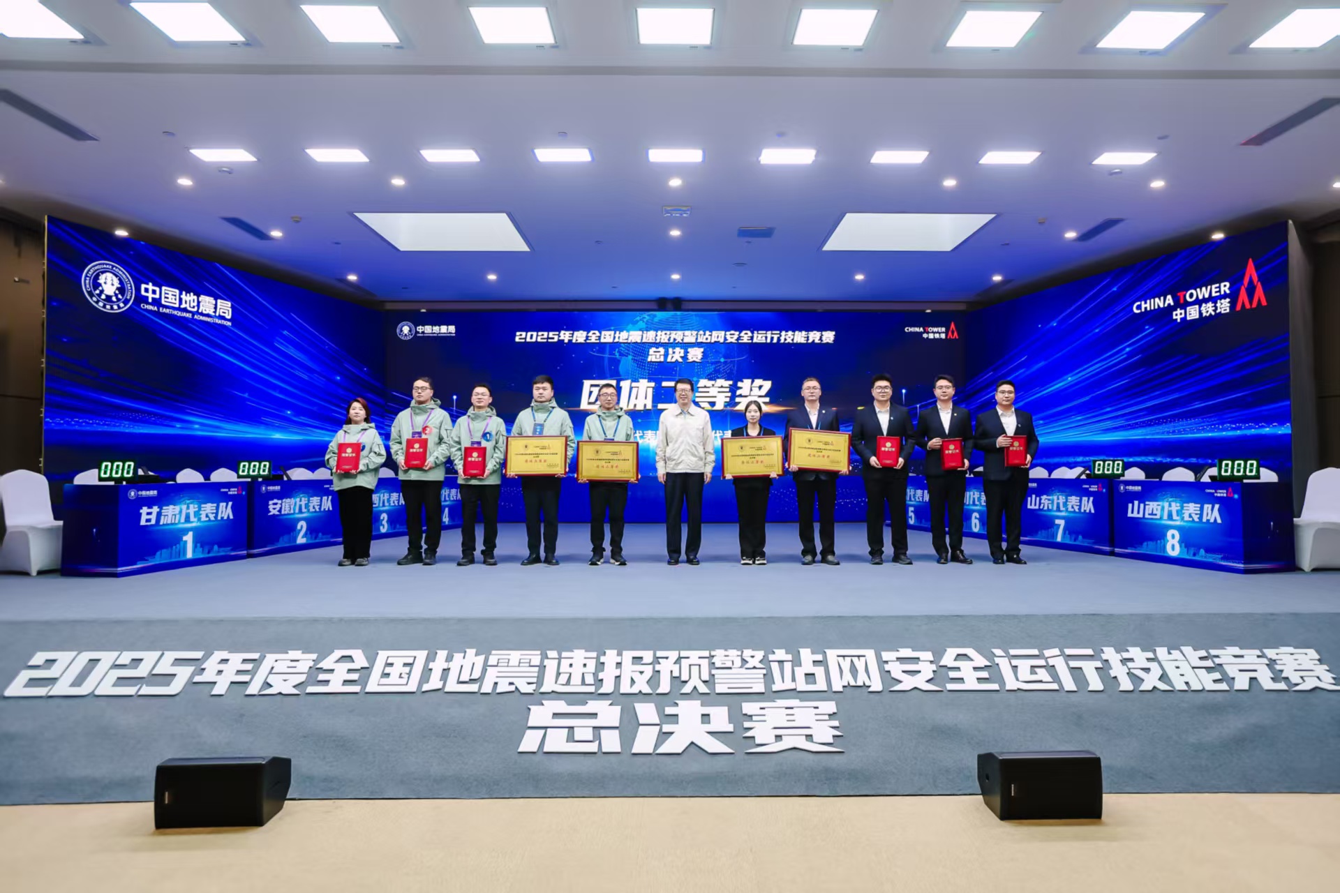 本次中国地震局与中国铁塔联合举办首次全国性技能比武,是为了大力弘扬工匠精神,以技能成才、技能报国,提升国家防灾减灾保障能力。本次竞赛吸引了全国31个省(区、市)超千名专业人员踊跃参与。赛事贯彻“以赛促学、以赛促训、以赛促战”理念,经过省内初赛及重庆、江苏、吉林、宁夏四个赛区复赛选拔,最终河北、山西、安徽、山东、湖北、四川、陕西、甘肃八支团体代表队和来自九个省市的个人赛精英进入全国总决赛。本次竞赛的举办,既是对双方合作成果的集中检验,也进一步深化了协同机制,提升了行业整体运维水平。中国地震台网中心、中国铁塔行业拓展部、中国地震局第一监测中心、中国铁塔运营维护部被大赛组委会授予优秀组织单位。